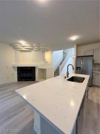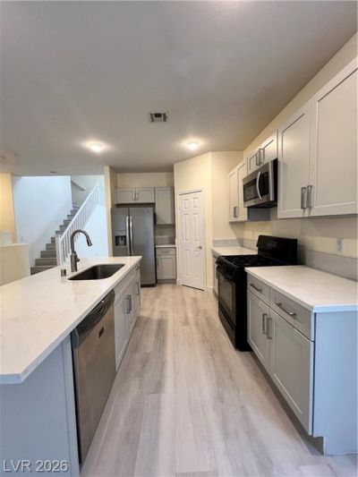 Center Las Vegas Golf and Guard Gated community, 4 bedroom 3.5 bath,2garage 2780 sq ft , high ceiling living room and dining area with built in entertainment center, luxury vinyl plank floor, upgraded kitchen quartz countertop with fashion cabinet , island with fashion faucet and sink. stainless steel refrigerator and microwave. Fireplace in the family room. Huge loft space can turn into a larger room, 2nd floor 2bedrooms with 2 full bathrooms. 1st Master bedroom with separate bath shower and tub. Double sinks in master and 2nd and 3rd bathrooms. 4th half bathroom next to 1st floor washer and dryer closet. Garage has one motorcycle pending to verify where to return.